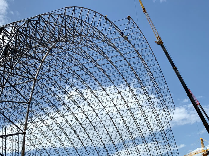 (2)网架加工前应对现场尺寸进行复测,确认无误后方可进行加工、安装;网架制作、运输、安装应遵守《空间网格结构技术规程》JGJ7-2010、《钢网架铁岭螺栓球节点》JG/T 10-2009、《钢网架铁岭螺栓球节点用高强度螺栓》 GB/T 16939-2016、《铁岭钢结构铁岭工程铁岭施工规范》 GB50755-2012、《铁岭钢结构铁岭工程铁岭施工质量验收标准》 GB50205-2020。